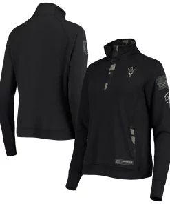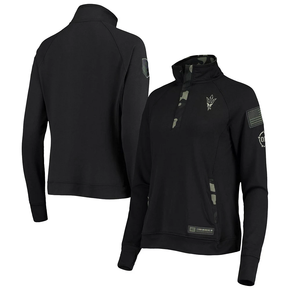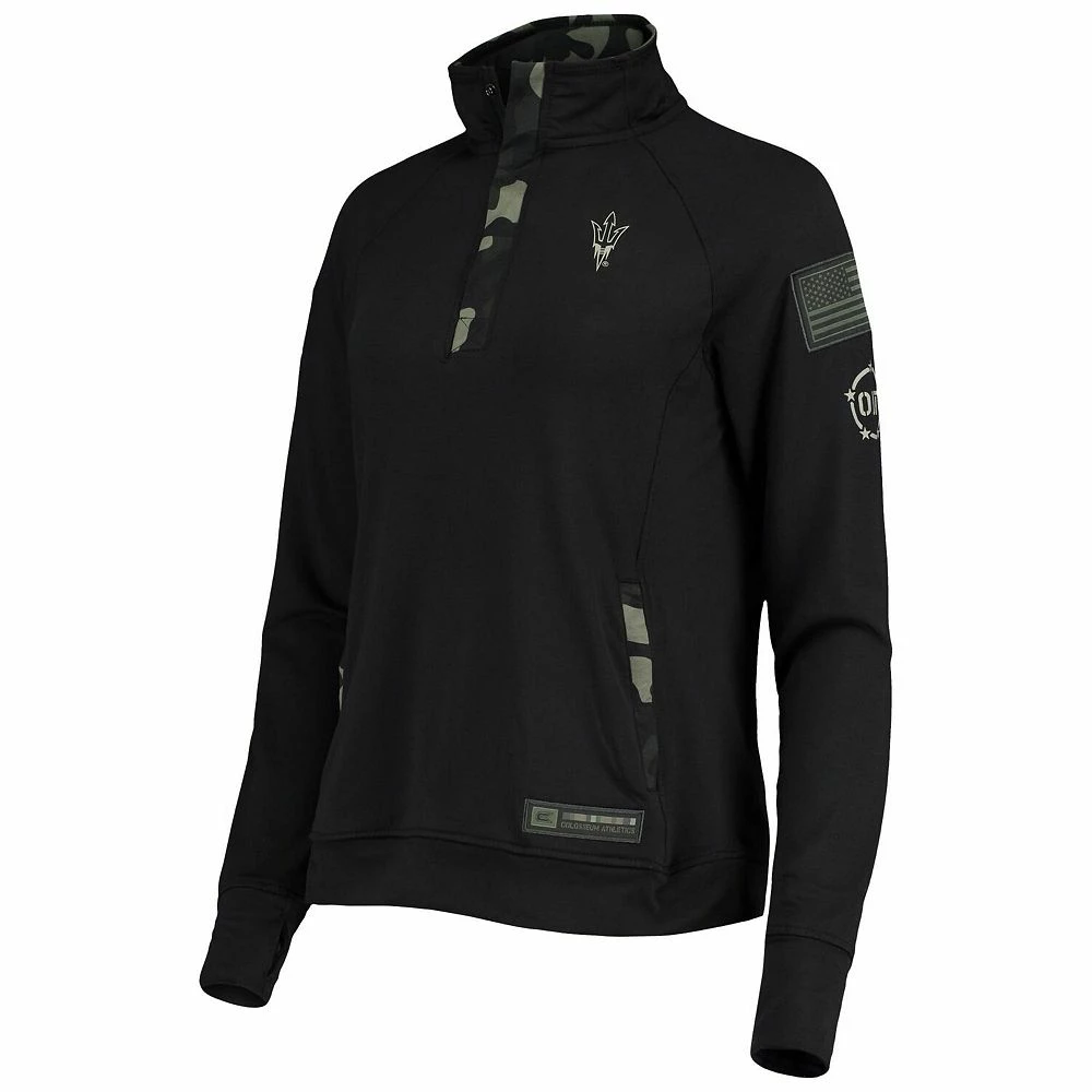 Support more than just the Arizona State Sun Devils when you wear this OHT Military Appreciation Depth quarter-snap jacket from Colosseum. It features printed Arizona State Sun Devils graphics on the front, an American flag applique on the left sleeve and camo trim. Raglan sleeves also provide some extra room for more flexible movement.
