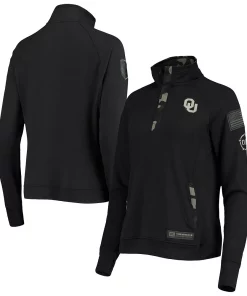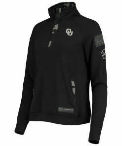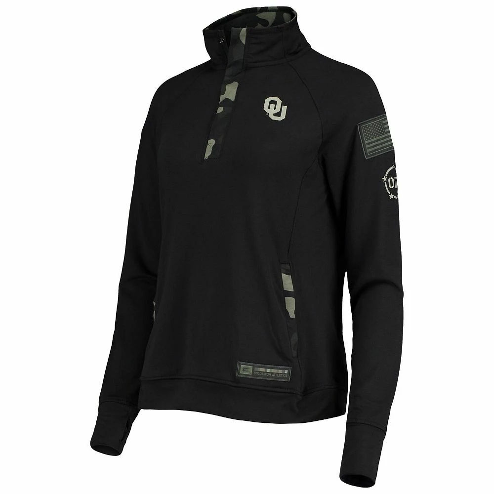 Support more than just the Oklahoma Sooners when you wear this OHT Military Appreciation Depth quarter-snap jacket from Colosseum. It features printed Oklahoma Sooners graphics on the front, an American flag applique on the left sleeve and camo trim. Raglan sleeves also provide some extra room for more flexible movement.