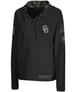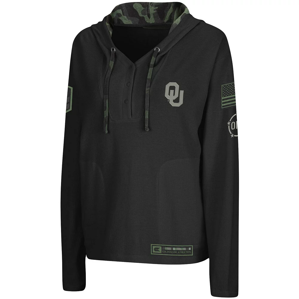 Show off your pride in the Oklahoma Sooners and those who defend our country with this OHT Military Appreciation Thermal Henley pullover hoodie from Colosseum. It features Oklahoma Sooners graphics printed on the front, an American flag embroidered on the left sleeve and a sublimated camo pattern on the hood’s interior and drawstring. The lightweight design will also help keep you at the ideal temperature.