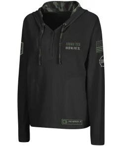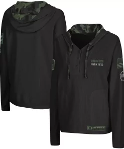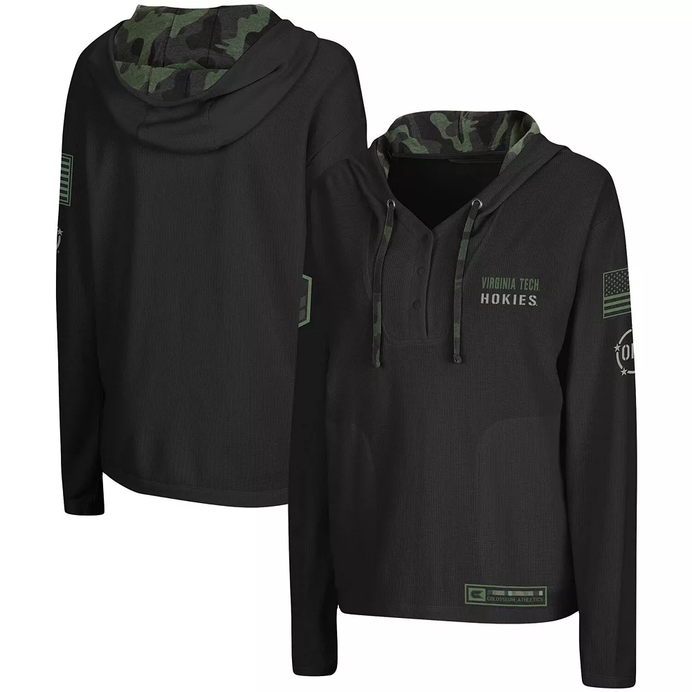 Show off your pride in the Virginia Tech Hokies and those who defend our country with this OHT Military Appreciation Thermal Henley pullover hoodie from Colosseum. It features Virginia Tech Hokies graphics printed on the front, an American flag embroidered on the left sleeve and a sublimated camo pattern on the hood’s interior and drawstring. The lightweight design will also help keep you at the ideal temperature.