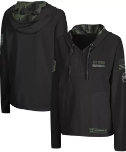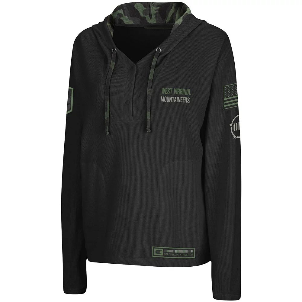 Show off your pride in the West Virginia Mountaineers and those who defend our country with this OHT Military Appreciation Thermal Henley pullover hoodie from Colosseum. It features West Virginia Mountaineers graphics printed on the front, an American flag embroidered on the left sleeve and a sublimated camo pattern on the hood’s interior and drawstring. The lightweight design will also help keep you at the ideal temperature.