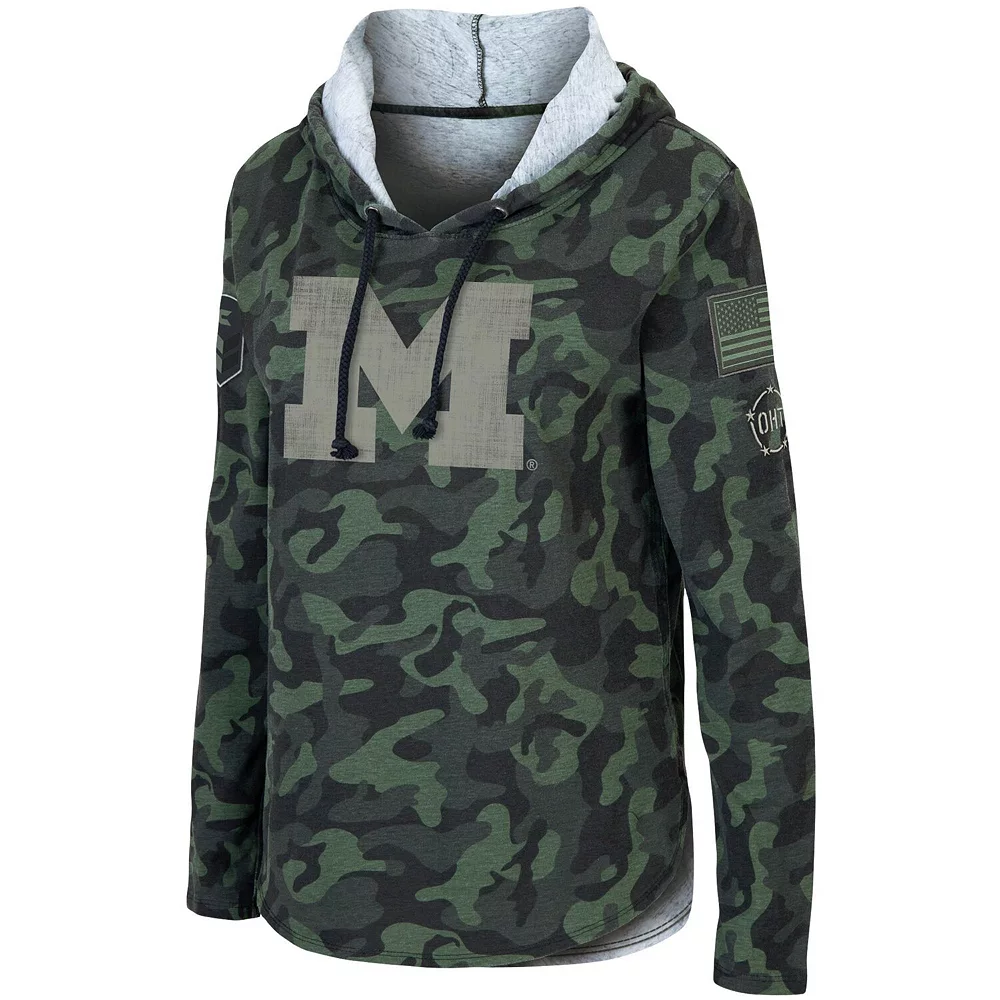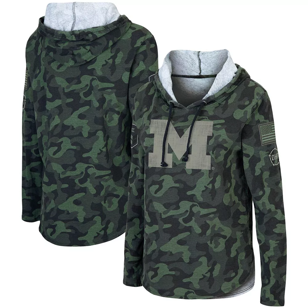 Pay tribute to service members as a devoted Michigan Wolverines fan by wearing this OHT Military Appreciation Hoodie T-shirt from Colosseum. It features a camo pattern with Michigan Wolverines graphics on the front and emblems of patriotic pride on the sleeves. You’ll stay warm while showing support for your favorite college team and military members in this comfy tee.