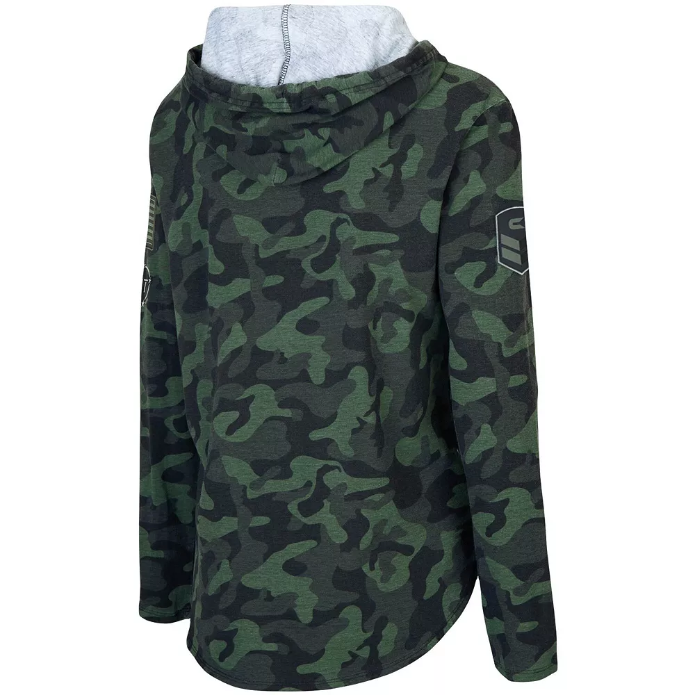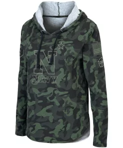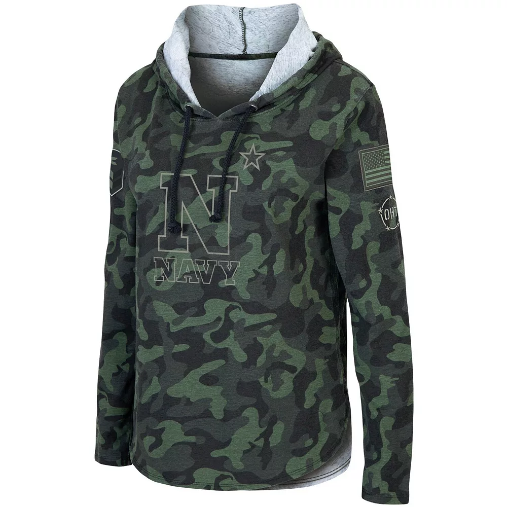 Pay tribute to service members as a devoted Navy Midshipmen fan by wearing this OHT Military Appreciation Hoodie T-shirt from Colosseum. It features a camo pattern with Navy Midshipmen graphics on the front and emblems of patriotic pride on the sleeves. You’ll stay warm while showing support for your favorite college team and military members in this comfy tee.