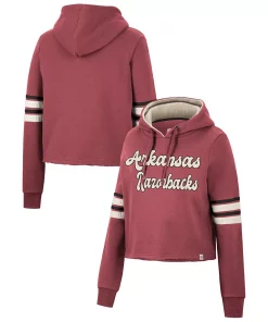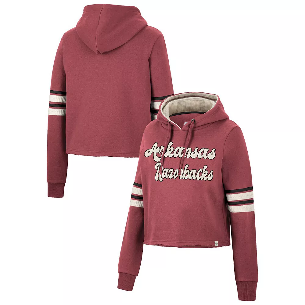 Layer up in chic style and show your support for the Arkansas Razorbacks with this Retro cropped hoodie from Colosseum. This bold pullover features a bold wordmark embroidered on the chest and comes in a classic team color for an unquestionable display of spirit. Plus, the unfinished hem offers a unique twist on your fandom, allowing you to add an extra layer to your Arkansas Razorbacks-inspired look before the next game.
