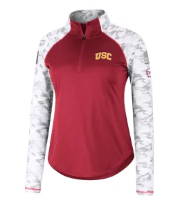 Offer your full support to our military members while also emphasizing your USC Trojans fandom with this OHT Flash quarter-zip jacket from Colosseum. The main body is comprised of authentic team colors while the sleeves feature a vibrant arctic camo design, which is separated by contrast-color stitching. The raglan sleeves and mock neck work together to make this patriotic top the most comfortable option for representing the USC Trojans.