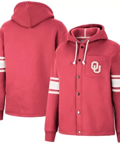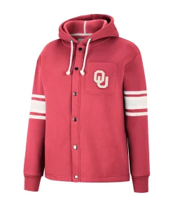 Layer up as you enjoy watching your Oklahoma Sooners in this Colosseum Mia full-snap jacket. Its soft hood and midweight design make it perfect for dedicated fans to wear on chilly game days. Decorated in signature Oklahoma Sooners colors, this jacket’s sleeve stripes help the subtle Oklahoma Sooners graphics stand out.