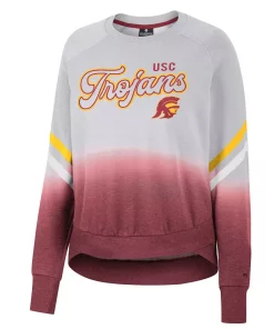 Upgrade your rotation of official USC Trojans apparel with this Cue Cards pullover sweatshirt from Colosseum. It features a vibrant dip-dye design and contrast-color stripes on the sleeves, making it a unique option for game day. The raglan sleeves offer increased movement and comfortability for your arms and shoulders, which will come in handy when you are cheering the USC Trojans on to victory.