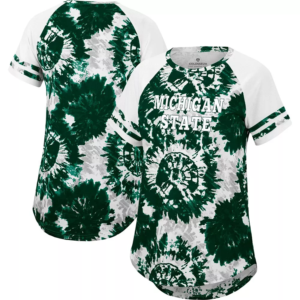 For a charming Michigan State Spartans game day get up, this Annie Oversized T-shirt by Colosseum is sure to draw the eye. It features roomy raglan sleeves for a natural range of motion, and a rounded droptail hem for extra coverage. Best of all, this tee features a trendy tie-dye pattern in signature Michigan State Spartans colors, and bold team graphics that easily flex your fandom.