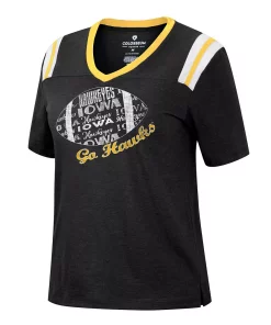 Showcase your love for Iowa Hawkeyes football with this 15 Min Early V-neck T-shirt from Colosseum. It features a bold team wordmark, logo and football graphic printed just below the flattering V-neckline. Plus, side split hems allow the shirt to move with you and offer a comfy fit and feel fit for any laid-back game day.