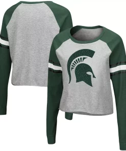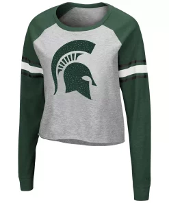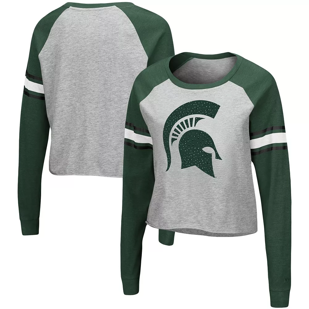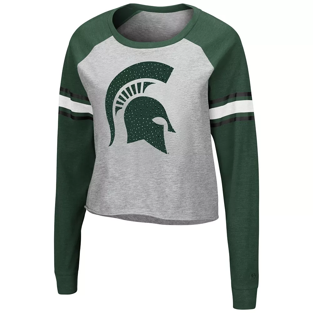 Let your Michigan State Spartans spirit shine in this Decoder Pin T-shirt. This chic top features a large Michigan State Spartans graphic on the chest with rhinestone embellishments that make your loyalty stand out for all the right reasons. In addition, the raglan sleeves offer ease of movement, so cheering on your team is all the more comfortable.