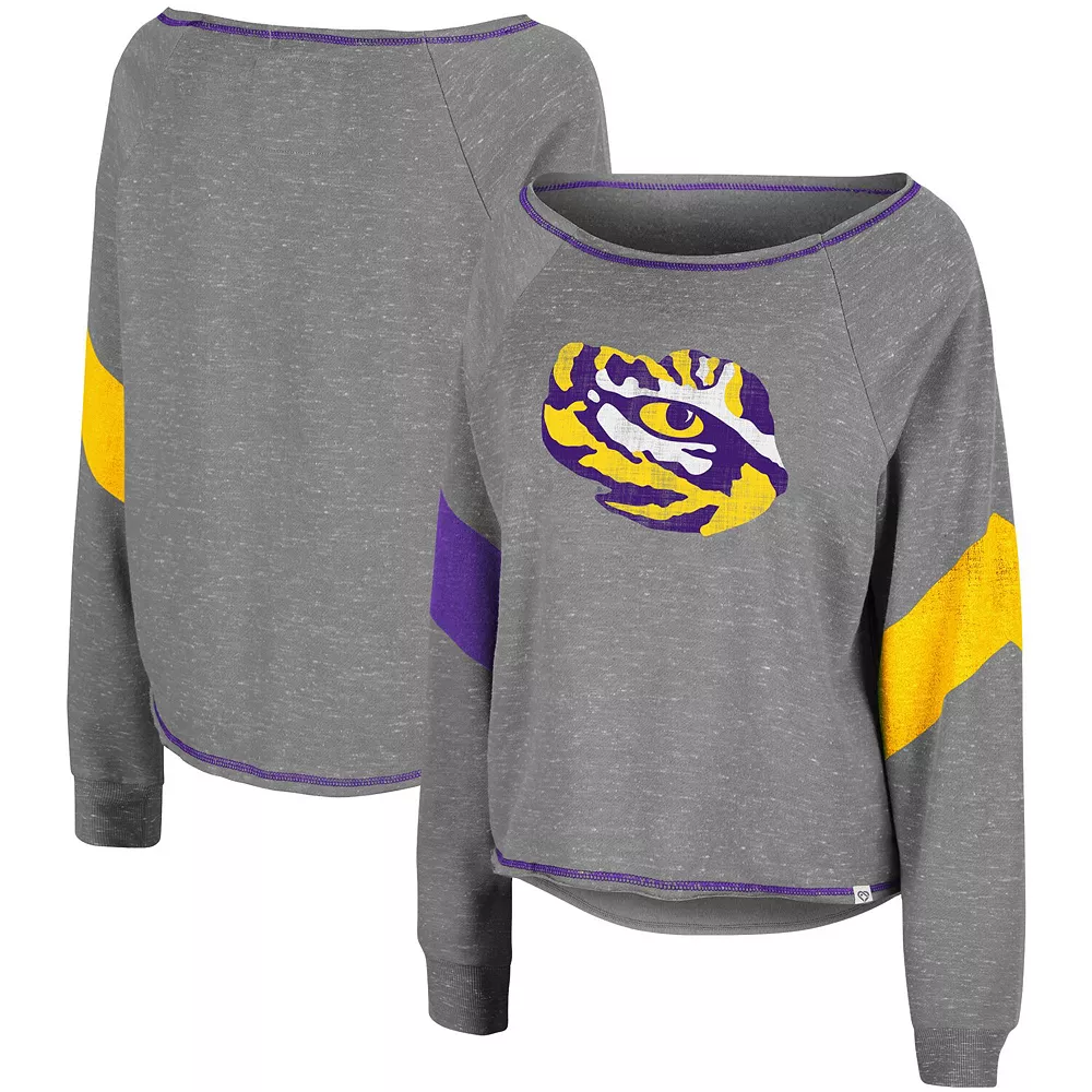 Make your LSU Tigers devotion effortlessly noticeable with this Amped pullover sweatshirt from Colosseum. It features a printed LSU Tigers logo emphasized by the team-colored chevron stripes and flatlock stitching. The boat neck also creates a more relaxed fit, and raglan sleeves provide some extra room for better movement.
