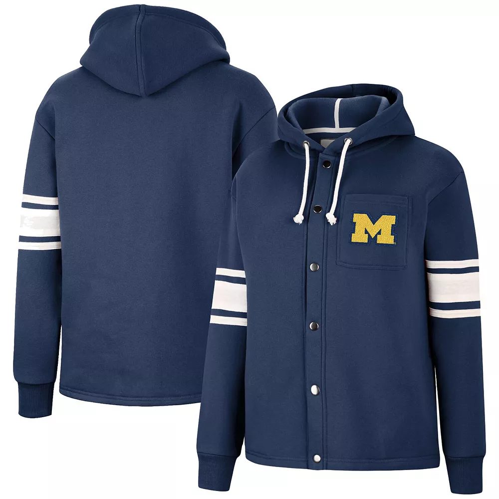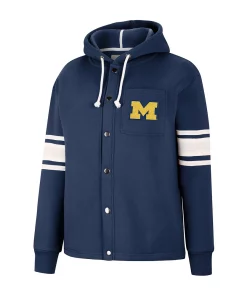 Layer up as you enjoy watching your Michigan Wolverines in this Colosseum Mia full-snap jacket. Its soft hood and midweight design make it perfect for dedicated fans to wear on chilly game days. Decorated in signature Michigan Wolverines colors, this jacket’s sleeve stripes help the subtle Michigan Wolverines graphics stand out.