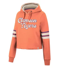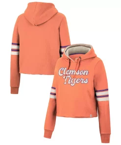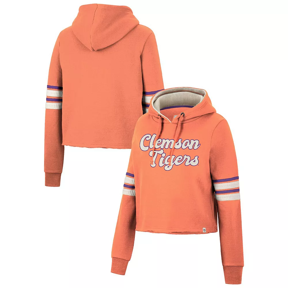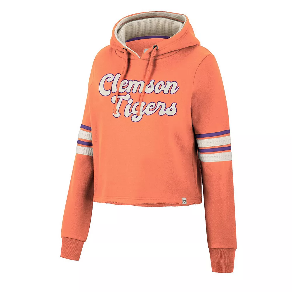 Layer up in chic style and show your support for the Clemson Tigers with this Retro cropped hoodie from Colosseum. This bold pullover features a bold wordmark embroidered on the chest and comes in a classic team color for an unquestionable display of spirit. Plus, the unfinished hem offers a unique twist on your fandom, allowing you to add an extra layer to your Clemson Tigers-inspired look before the next game.