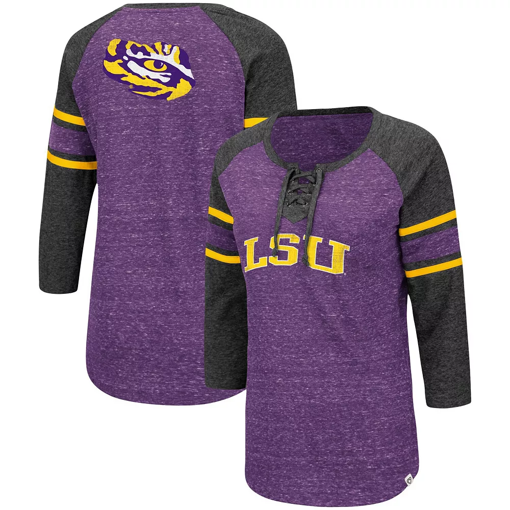 Showcase your devotion to the LSU Tigers with a trendy look by reaching for this Scienta Pasadena 3/4 Sleeve Space Dye T-shirt. It features bold LSU Tigers graphics, a lace-up neckline and raglan sleeves for a comforting fit with each wear. Sport this two-toned tee and enjoy a cool, casual display of your unwavering commitment to your squad!