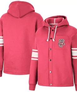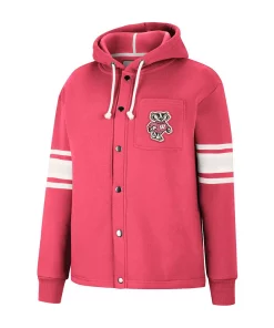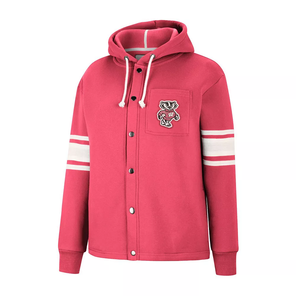 Layer up as you enjoy watching your Wisconsin Badgers in this Colosseum Mia full-snap jacket. Its soft hood and midweight design make it perfect for dedicated fans to wear on chilly game days. Decorated in signature Wisconsin Badgers colors, this jacket’s sleeve stripes help the subtle Wisconsin Badgers graphics stand out.