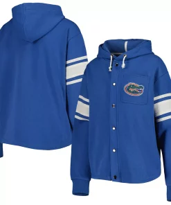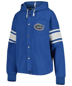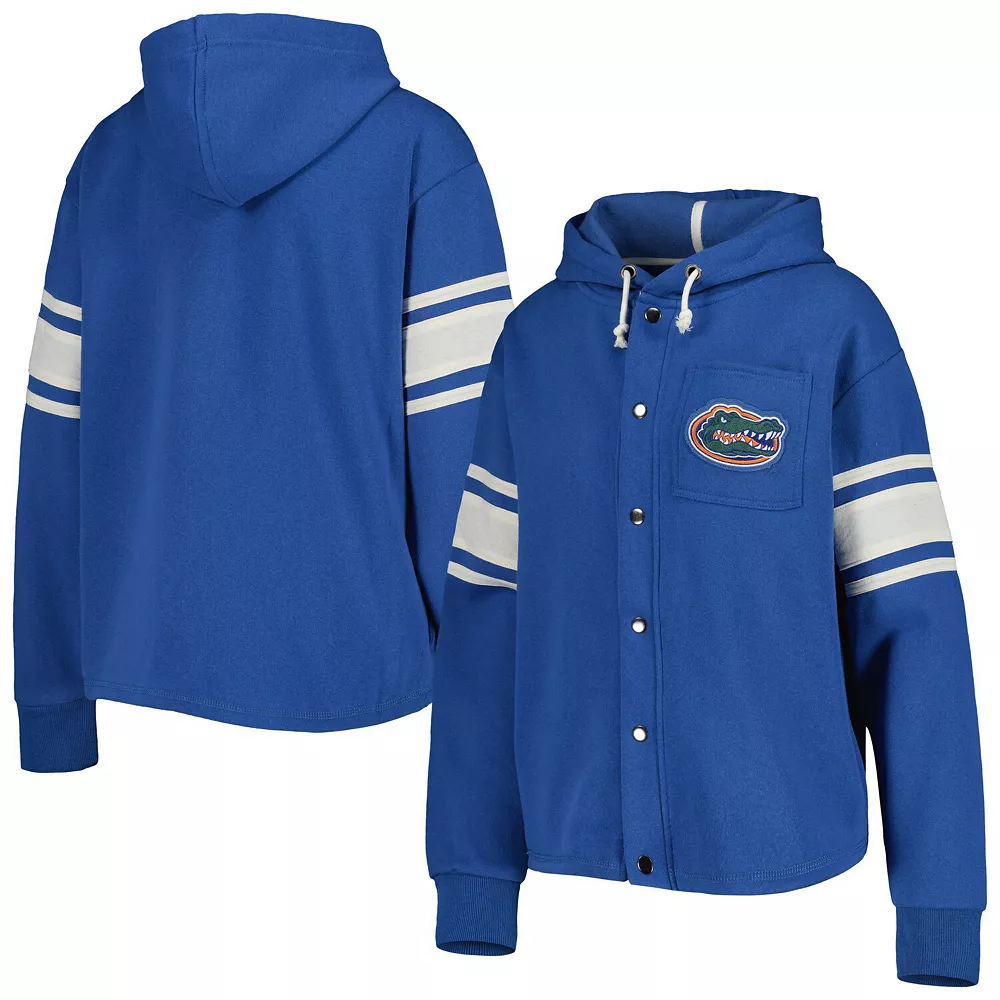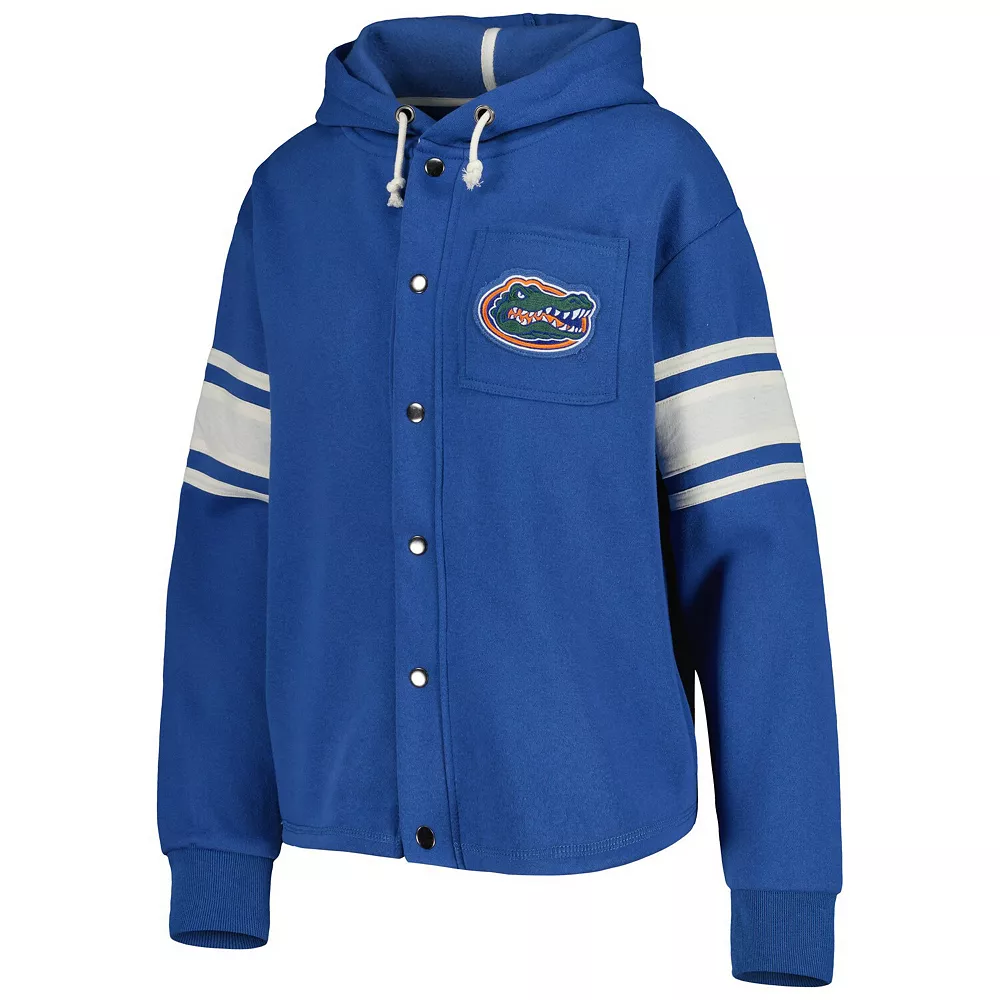 Layer up as you enjoy watching your Florida Gators in this Colosseum Mia full-snap jacket. Its soft hood and midweight design make it perfect for dedicated fans to wear on chilly game days. Decorated in signature Florida Gators colors, this jacket’s sleeve stripes help the subtle Florida Gators graphics stand out.