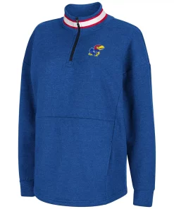 Keep your Kansas Jayhawks spirit going strong during the chilly months with this Alice 2-Hit quarter-zip jacket from Colosseum. Its fleece lining will keep you warm and cozy, while the Kansas Jayhawks graphics and colors attest to your never-ending loyalty. Regardless of the temperature outside, your fandom will be burning brightly!