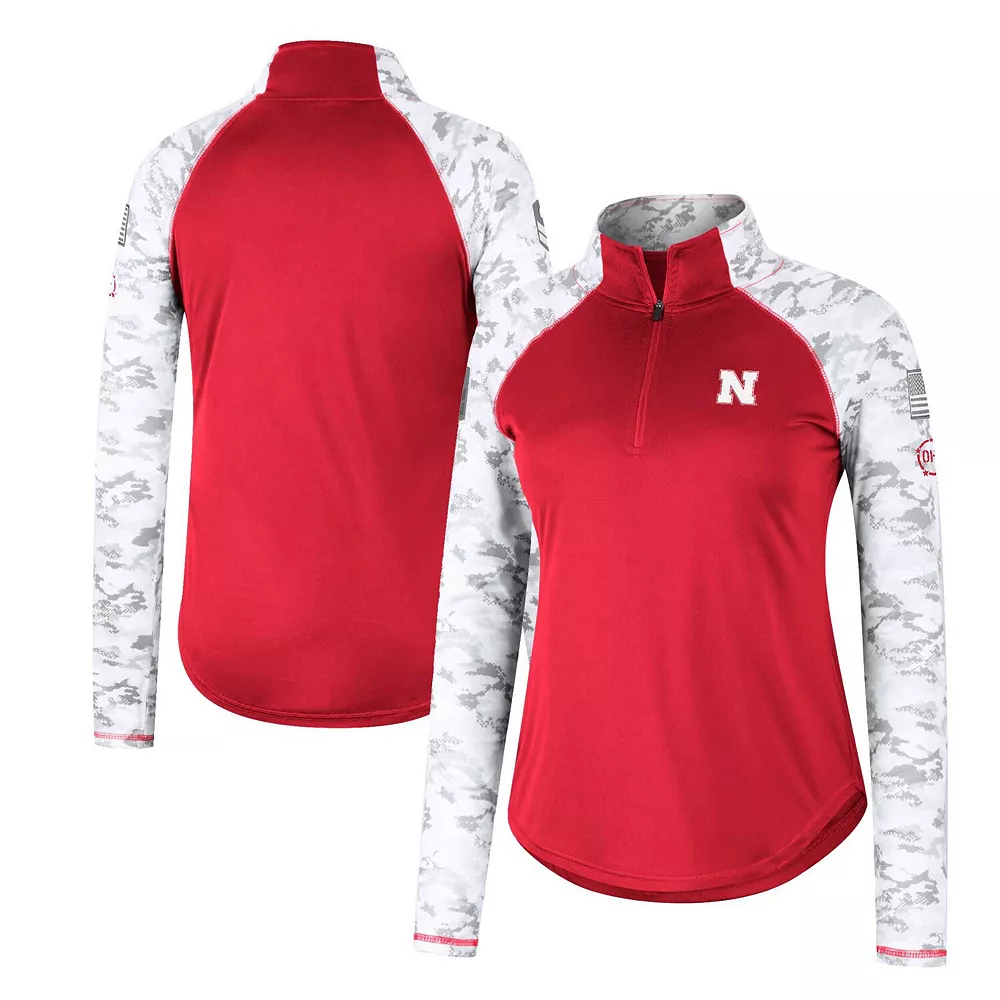 Offer your full support to our military members while also emphasizing your Nebraska Huskers fandom with this OHT Flash quarter-zip jacket from Colosseum. The main body is comprised of authentic team colors while the sleeves feature a vibrant arctic camo design, which is separated by contrast-color stitching. The raglan sleeves and mock neck work together to make this patriotic top the most comfortable option for representing the Nebraska Huskers.