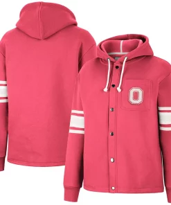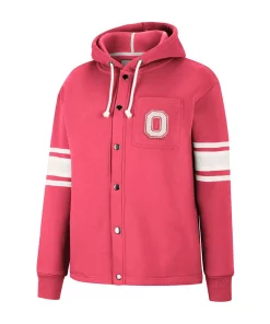 Layer up as you enjoy watching your Ohio State Buckeyes in this Colosseum Mia full-snap jacket. Its soft hood and midweight design make it perfect for dedicated fans to wear on chilly game days. Decorated in signature Ohio State Buckeyes colors, this jacket’s sleeve stripes help the subtle Ohio State Buckeyes graphics stand out.