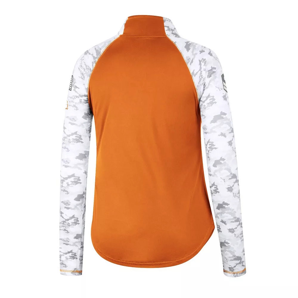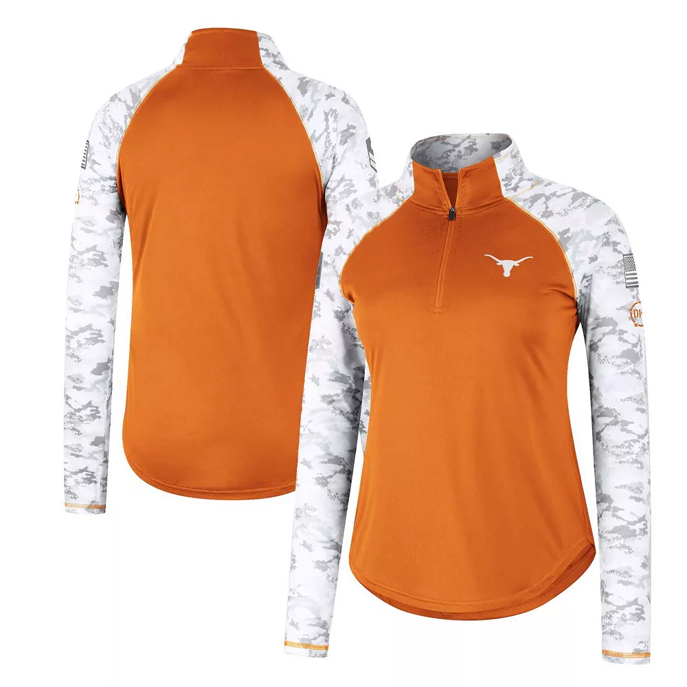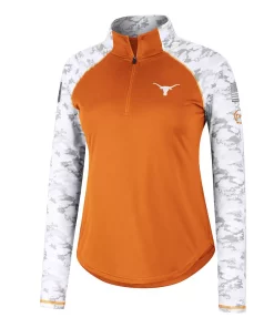 Offer your full support to our military members while also emphasizing your Texas Longhorns fandom with this OHT Flash quarter-zip jacket from Colosseum. The main body is comprised of authentic team colors while the sleeves feature a vibrant arctic camo design, which is separated by contrast-color stitching. The raglan sleeves and mock neck work together to make this patriotic top the most comfortable option for representing the Texas Longhorns.