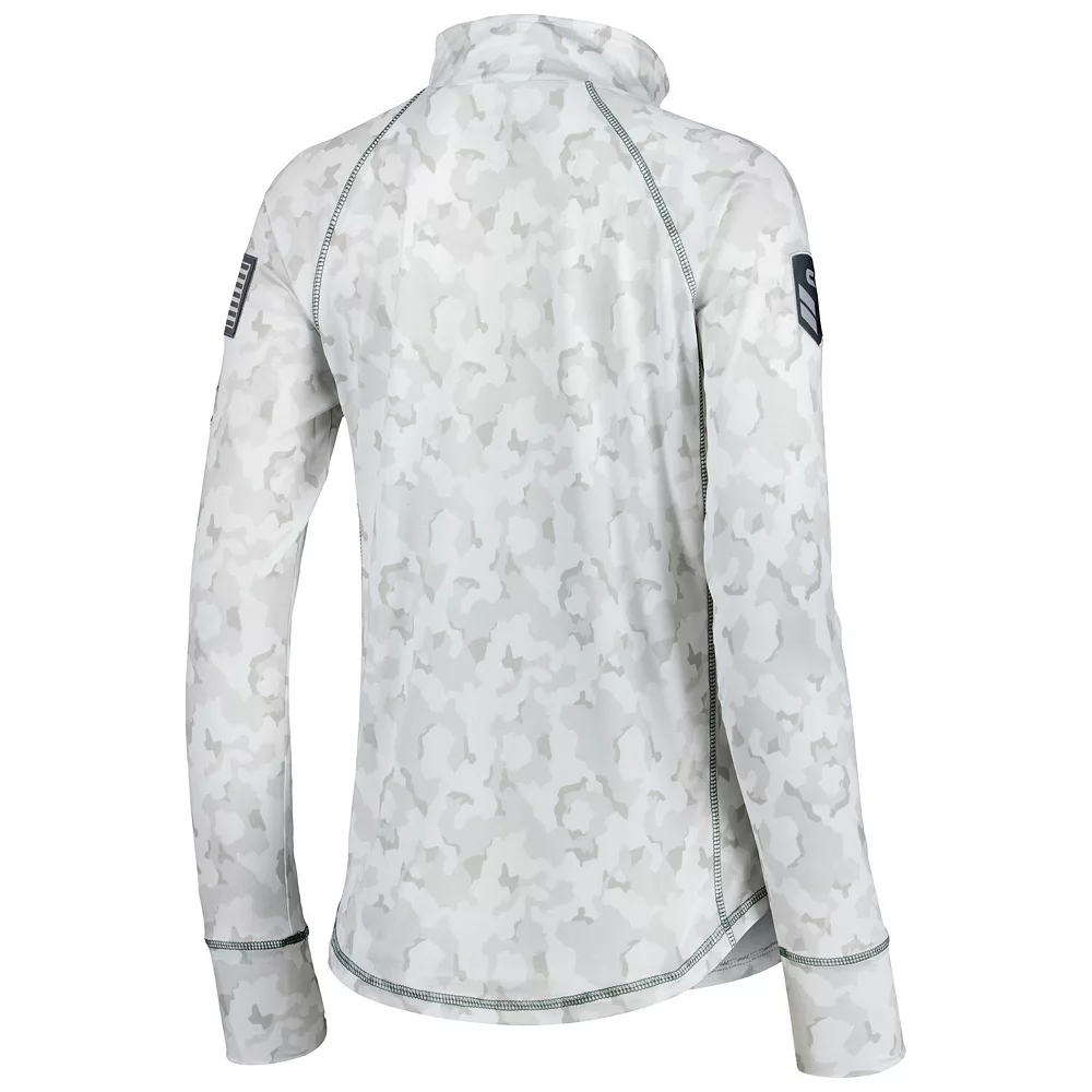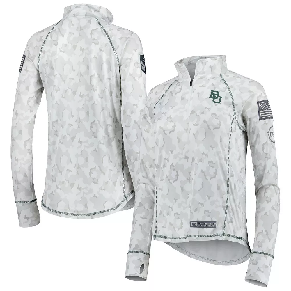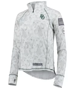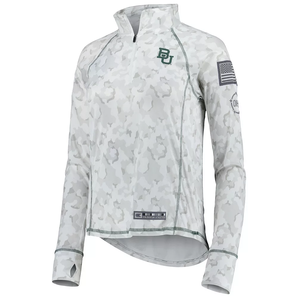 No matter where you watch the next Baylor Bears game, make sure your look is as strong as ever in this Operation Hat Trick Military Appreciation Officer Arctic Camo quarter-zip jacket. This piece of Colosseum gear features a distinct camo design and the Baylor Bears logo is proudly displayed on the chest. The raglan sleeves give you more maneuverability, and the contrasting trim adds a touch of color to an already stylish piece.
