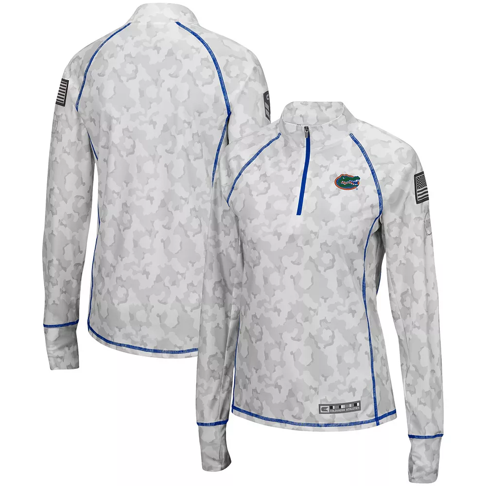 No matter where you watch the next Florida Gators game, make sure your look is as strong as ever in this OHT Military Appreciation Officer Arctic Camo 1/4-zip jacket. This piece of Colosseum gear features a distinct camo design and the Florida Gators logo is proudly displayed on the chest. Sport this over your go-to team tee for a complete look you will be proud to show off this season.