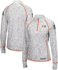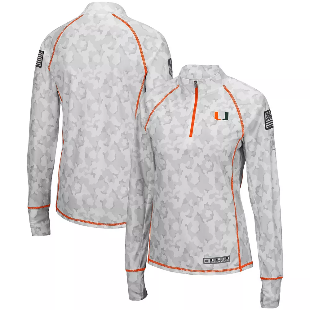 No matter where you watch the next Miami Hurricanes game, make sure your look is as strong as ever in this OHT Military Appreciation Officer Arctic Camo 1/4-zip jacket. This piece of Colosseum gear features a distinct camo design and the Miami Hurricanes logo is proudly displayed on the chest. Sport this over your go-to team tee for a complete look you will be proud to show off this season.