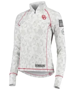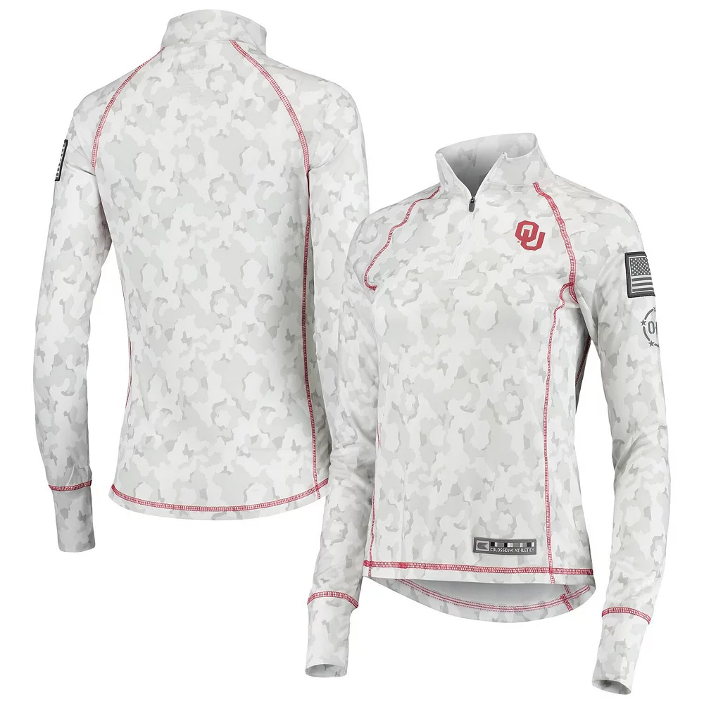 No matter where you watch the next Oklahoma Sooners game, make sure your look is as strong as ever in this OHT Military Appreciation Officer Arctic Camo 1/4-zip jacket. This piece of Colosseum gear features a distinct camo design and the Oklahoma Sooners logo is proudly displayed on the chest. Sport this over your go-to team tee for a complete look you will be proud to show off this season.